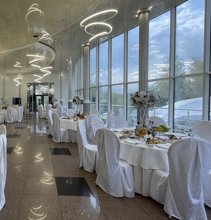 Имеются два зала. : на 50 чел и до 200 чел. Залы светлые, красивые , просторные, с высокими потолками, технически оснащенные . А главное-панорамные окна и шикарный вид на реку и зелень. Большие размеры зала позволяют сделать расстановку столов в нескольких вариантах .